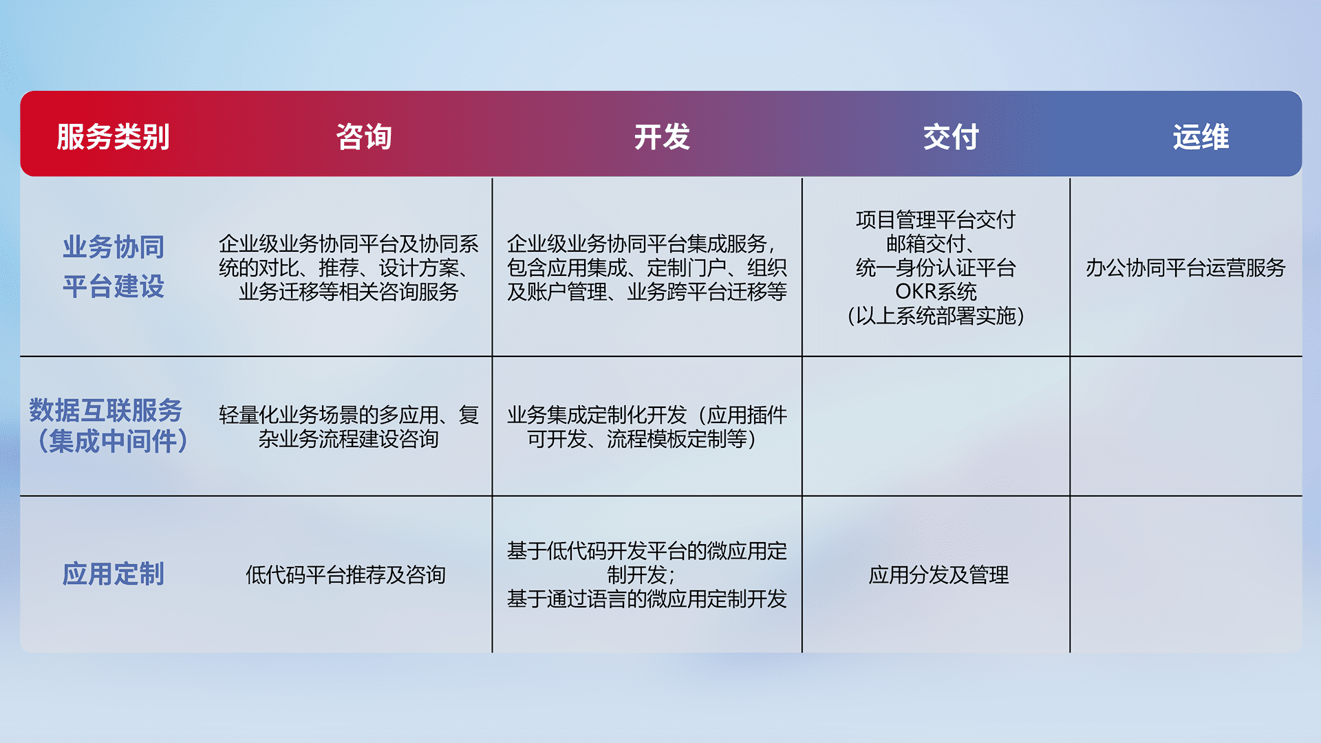 针对钉钉、、、企微、、IDaas等平台级产品提供产品的规划、、方案、、、、交付、、、定制化开发等服务,,,实现如统一协同办公、、智能客户服务、、、、混合会议管理、、智能数据查询、、等业务场景,,,,实现数字化转型。。。