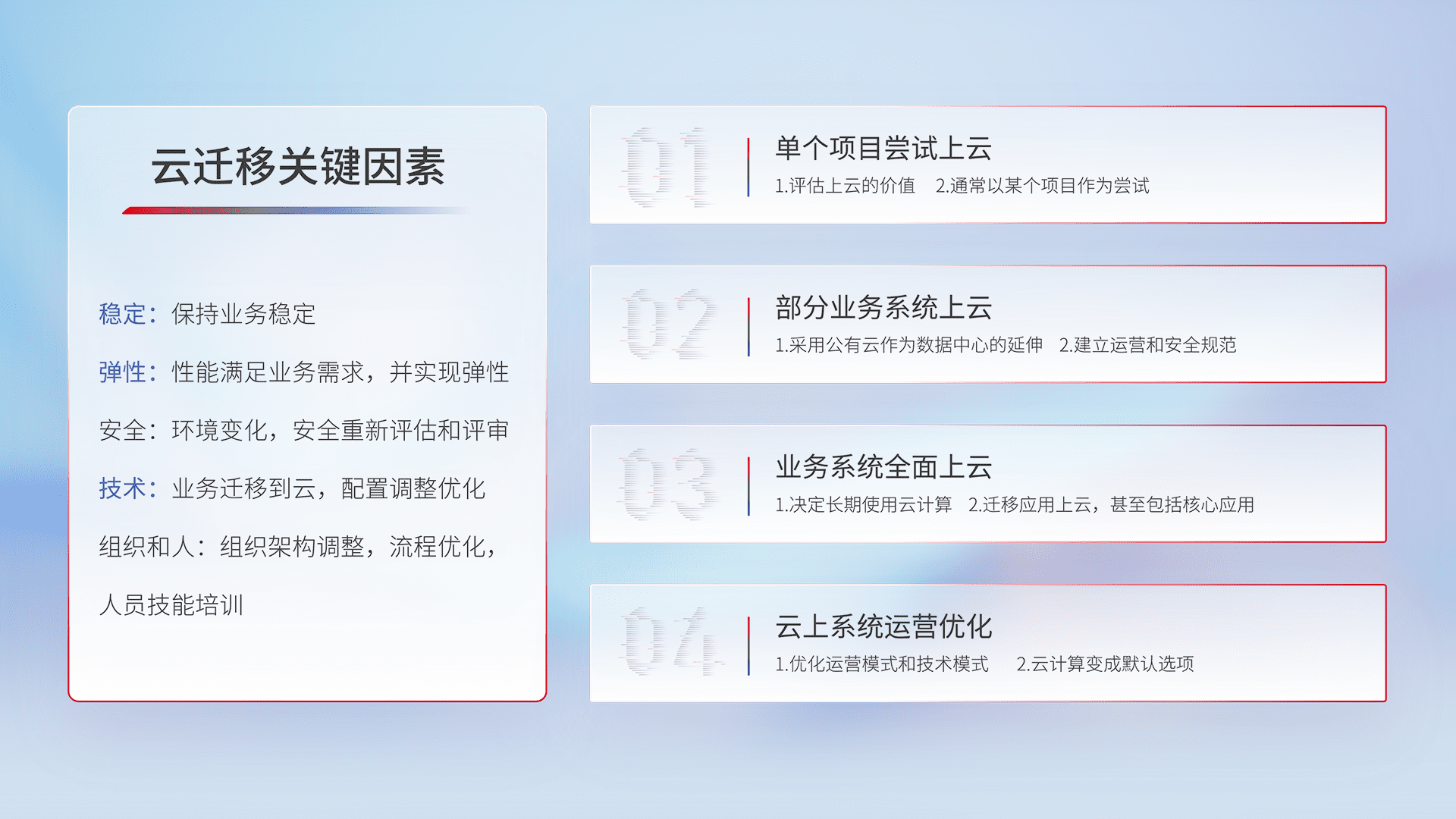 结合实际业务,,,,从规划设计、、、云平台选型、、、、云原生改造、、、数据迁移、、、、集成交付,,迁移全过程为客户识别最佳上云路径,,做好风险识别管理,,,,设计网络架构、、、身份权限、、安全审计合规、、、操作审计、、、日志审计、、监控告警策略、、、、多站点容灾设计等,,,,对云上基础设施进行整体规划,,,,提升IT治理水平,,,,以满足弹性、、、高可用、、高性能的需求。。。。