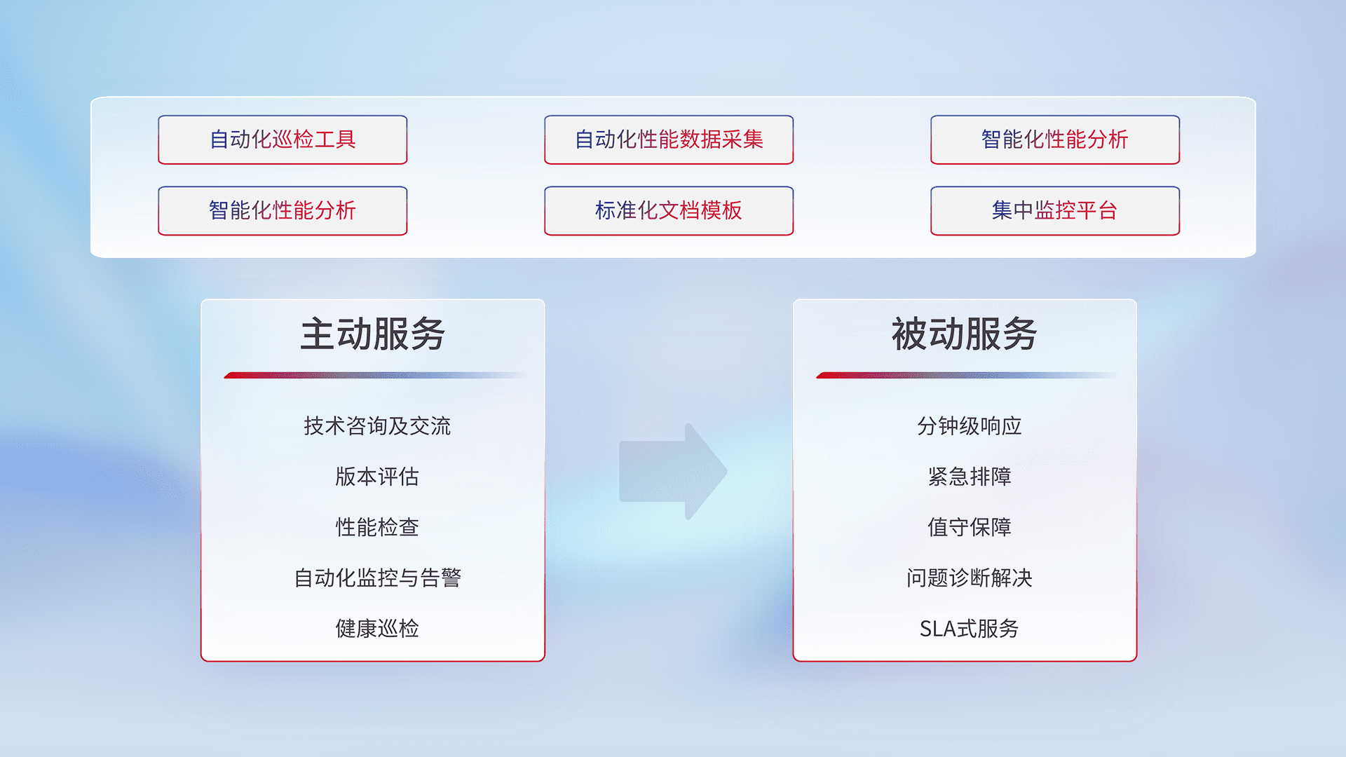 智能化工具和标准化文档,,保障服务质量,,,提供主动服务(包含技术咨询、、版本评估、、、性能检查、、、自动化监控与告警、、、、健康巡检)和被动服务包含(分钟级响应、、、、紧急排障、、、值守保障、、问题诊断解决、、、、SLA服务)。。
